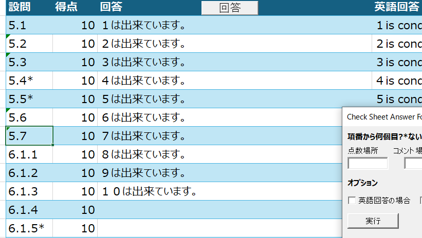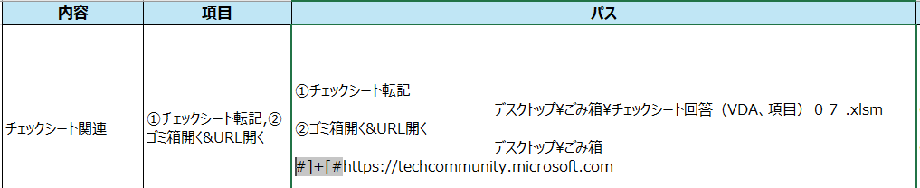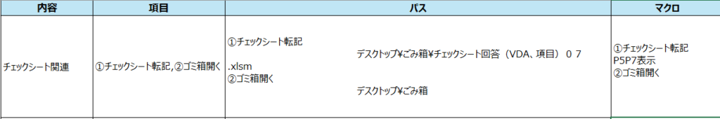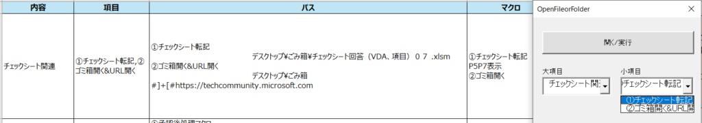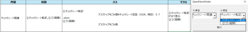 チェックシート関連の大項目に対して、チェックシート転記マクロと、ごみ箱のパスが記載されています。①チェックシート転記を選択した場合は、パスに基づいたファイルが開きます。もしマクロ列に値があり、プロシージャ名が記載されている場合はマクロも実行されます。