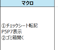 UFでは、マクロ列に選択した項目があり、その項目に文字が入っている場合、マクロと見なして実行します。下記であれば、項目からチェックシート転記を選んで実行すると、マクロ列にある「P5P7表示」が取得され、マクロとして実行されます。ここでのマクロ名は、実行したいプロシージャ名を記入してください。