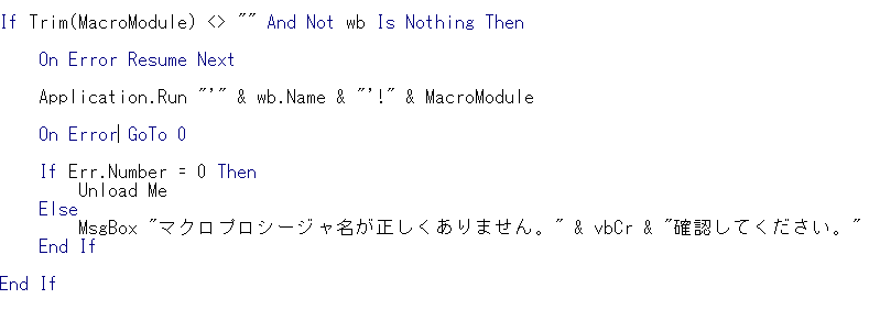 マクロの列から値を取得できた場合は、マクロプロシージャ名である前提で、開いたマクロファイルのマクロを実行します。マクロモジュールではなかったり、プロシージャ名が存在しなかった場合はエラーとなり、Msgboxが表示されます。