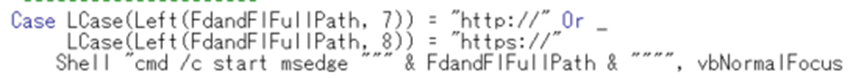 もしエッジではない場合は、msedgeを右のように修正してください。Shell "cmd /c start chrome """ & FdandFlFullPath & """", vbNormalFocus