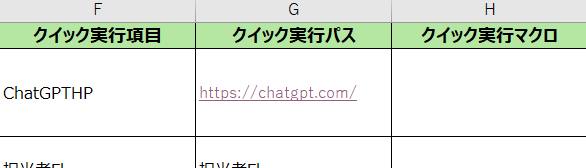 記載のスクリプト等を即座に実行するため、UFの右側にQuickボタン欄を設けています。シート上のF~G列に上記同様に記載することで指定したパスを実行可能です。Fに記載された項目がUF上でその分記載され、押すことでパス実行されます。マクロ実行の場合は上記同様にファイルとプロシージャ名を記載することで実行されます。