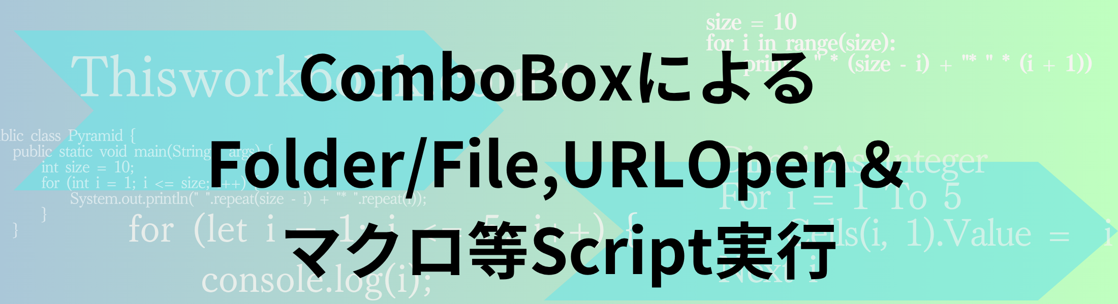 動的コンボボックスによるファイルフォルダをURL開いたり、マクロを実行するマクロです。事務的な業務ではいくつものマクロファイルや、フォルダがあり、それを開いたりマクロ実行するのは少し面倒です。VBAのユーザーフォームをプラットフォームにすることで、すべてのフォルダやファイルをボタン一つで開いたり、マクロ実行ができます。