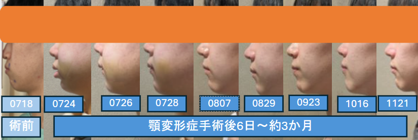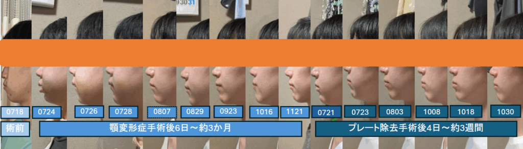 術前から、顎変形症手術とプレート除去手術を同じ日付間隔でまとめました。術後は1日、2日、1週間、1か月の間隔で比較しています。術後数日後が腫れのピークになることが多いため、2日も入れています。