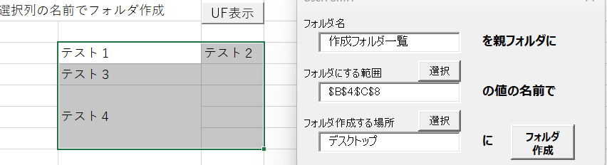 指定したセル範囲を名前としてフォルダを作るマクロです。UF上で指定した親フォルダ名と作成場所に基づいて、フォルダを作成します。