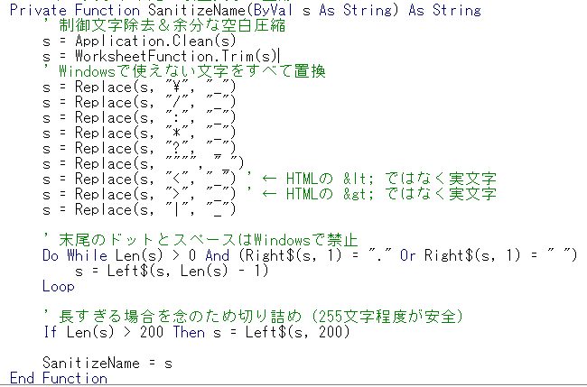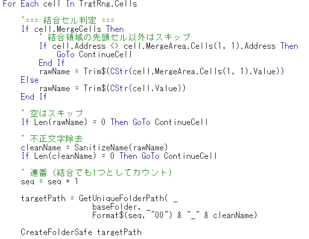 選択したセルを対象にフォルダを作成します。通常のセルループで問題となるのが結合セルですが、すべての選択セルに対応できるようにしています。