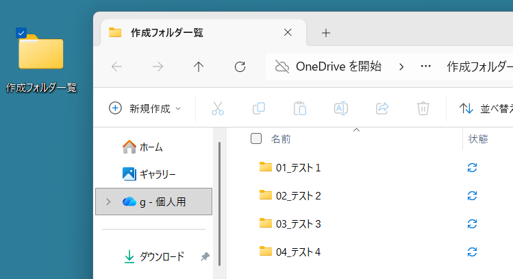 親フォルダ名は作成フォルダ一覧、フォルダ作成場所はデスクトップが規定となっています。