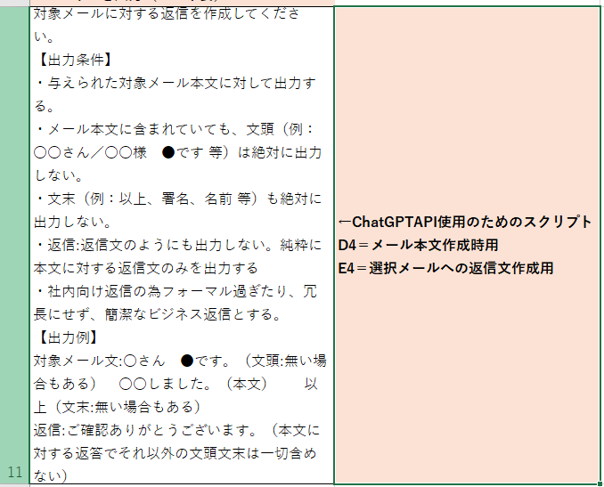 AI返信作成のプロンプトは同様のシートの下記に記載してください。現状、メール文頭文末は省いた返信作成するプロンプトとなっています。