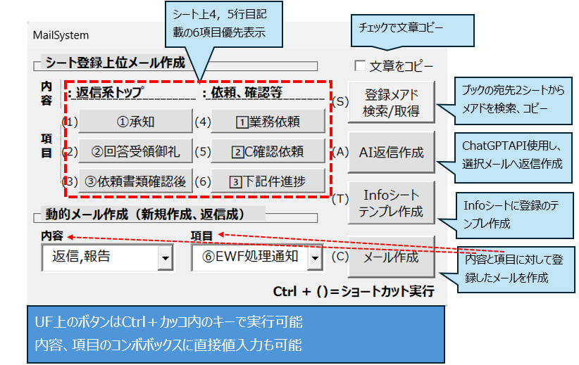 | #MAIL本文# | UF上にMultiline入力ボックスが表示されます。GPT使用/英訳/返信オプションが選べます。 |