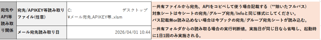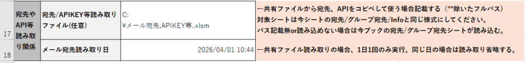 InfoシートD17にてファイルパス記載箇所があります。これは、メールアドレスとAPIkeyなど記載した宛先/グループ宛先及びInfoシートの指定箇所に情報をコピペする元となるファイルです。