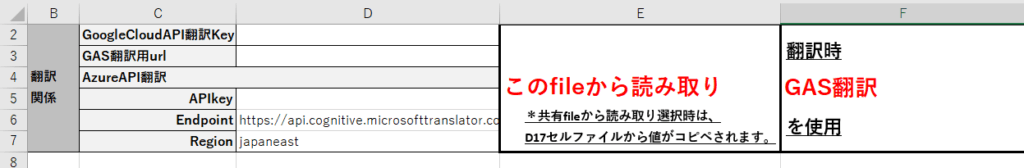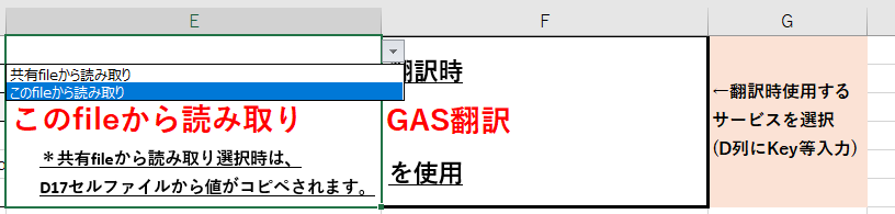 また、E列からAPI等の読み取り先ファイルを選択できます。このfileから読み取りの場合は、記載されているKey等を元に和英訳可能です。