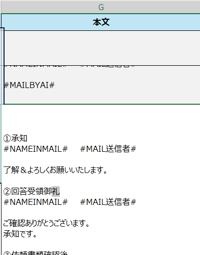 | #MAILBYAI# | プロンプトInfoシート設定プロンプトに基づいて、ChatGptAPIにより選択メール文に対する返信文を作成します。 |
