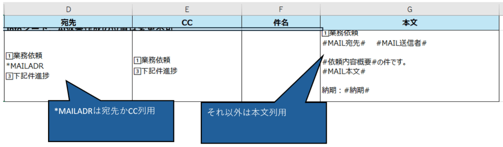| *MAILADR(宛先/CC列用) | 宛先/グループ宛先シート情報元にUFから手動で宛先/CCを選択し、メアドと本文中の#MAIL送信者#に置換えられます。 |
