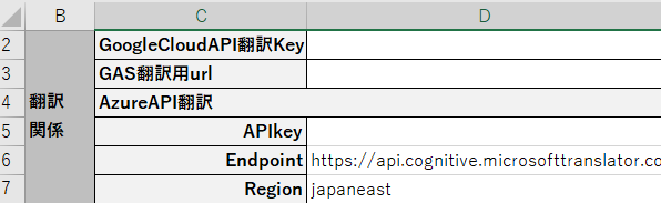 下記の状態ならD列のGAS行の値から翻訳が実行されます。