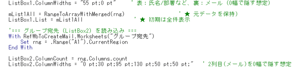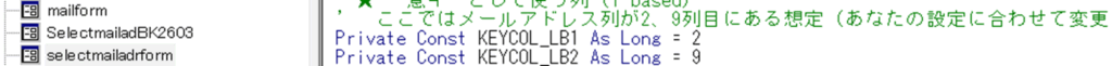 もしUF上での選択場所の取得列場所を変更したい場合は、下記のLB1,2変数(それぞれ宛先/グループ宛先シートの取得オフセット値)に対して列を数値で入力してください。