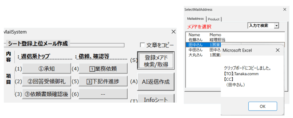 上位のように記載することで、この行が選択された場合に宛先に田中さん、CCに中田さんを一気に設定することができます(#MAIL#宛先は上のTo列値に置き換えられる)。