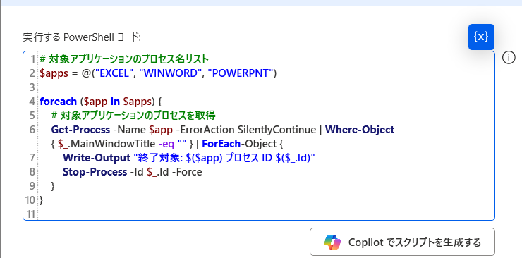 Scripting.RunPowershellScript.RunPowershellScript Script: $'''# 対象アプリケーションのプロセス名リスト