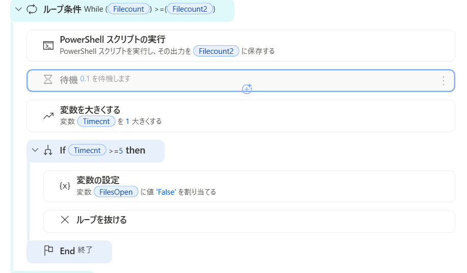 今フローではファイル数が同じである場合はループをして、ファイルが開くまで処理を続けます。ファイル数が増えれば、ファイルが開いたことになり、FilesOpen変数にTrue,Falseが代入されます。ループにてループインデックスが5になった場合はループを終了させています。