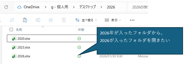 今回は指定フォルダ名に2026年という文字が入っている場合に、その中にある2026年~というファイルを開きたいとします。