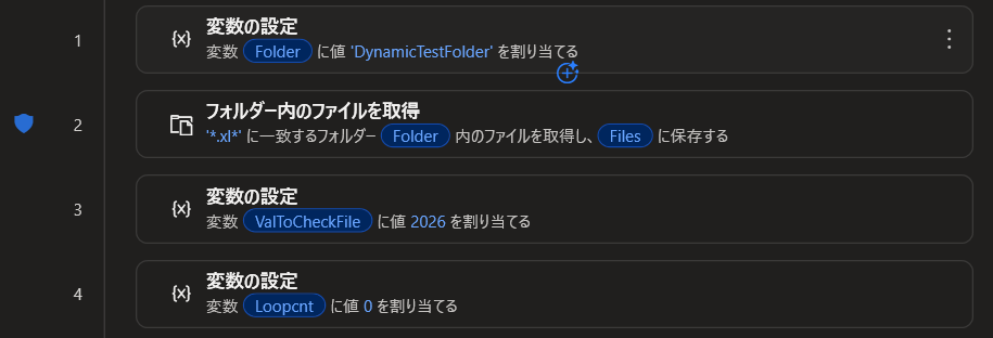 まず、フロー戦闘でFolder変数に指定のフォルダパスを入れます。今回はDynamicTestFolderとしていますが、他のフローで取得した動的なパスや使用するパスを指定してください。