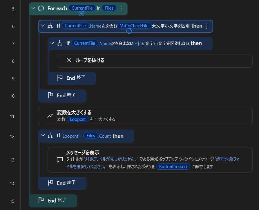 その後ループによる条件分岐でファイルを開きます。指定フォルダからファイルすべてを走査し、名前と上記の指定キーワードを比較します。
