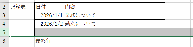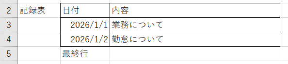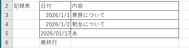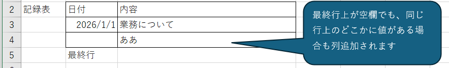 また、記録表で日付が記載ない場合であっても、同じ行上に値があればそれは最終行として判断し、上記の新しい行が追加されます。