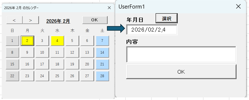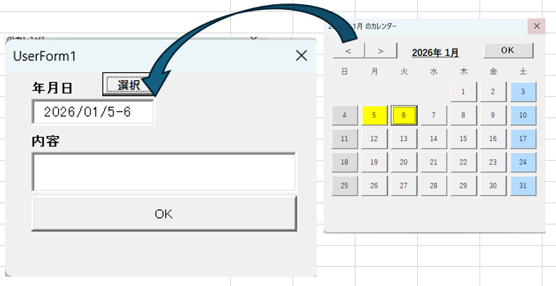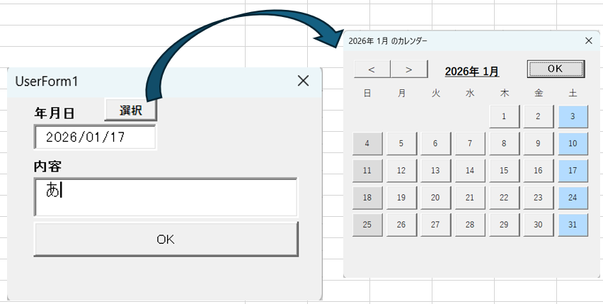 今UFでは日付と内容のテキストボックスが配置され、入力値が配列に入れられ、指定行に転記されます。日付はカレンダーから選択できます。