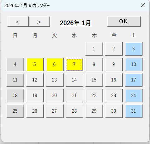 カレンダーはマクロによりその月のカレンダーが日土を左右に配置し、表示されます。土日は色付きであり、選択すると強調されるようになっています。