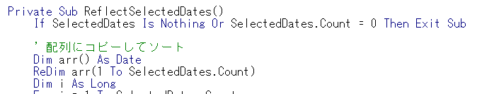 OKを押すと選択した日付は対象月、ReflectSelectedDates関数で日により日付が変換されます。ロジックとしては選択した日時を昇順で表示し、同じ月の場合にはまとめて表示するなど調整されます。