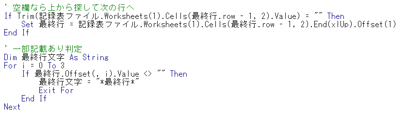 取得した最終行があれば、その行の上:値が記載されている最終行にて値が記載されているかを判定します。記載ある場合、「最終行文字」変数に値を入れます。