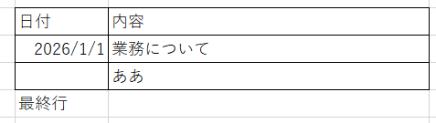 下記のような記録表を想定し、日付と内容を最終行に転記したいとします。最終行には最終行というキーワードがあり、そのセルの上に値があるかどうかで、列追加、転記が適切に実施されます。