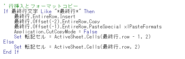 最終行取得後は、上記判定結果に応じて新しい列を追加等します。「最終行文字」変数に値がある場合、列を追加し、無ければそのまま転記します。