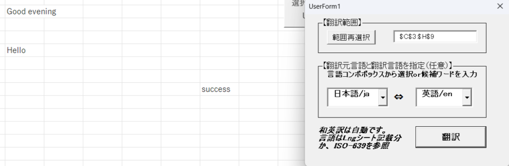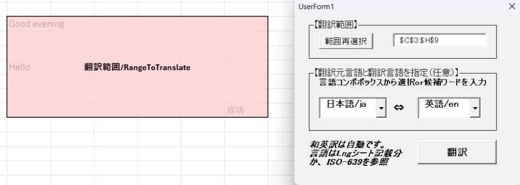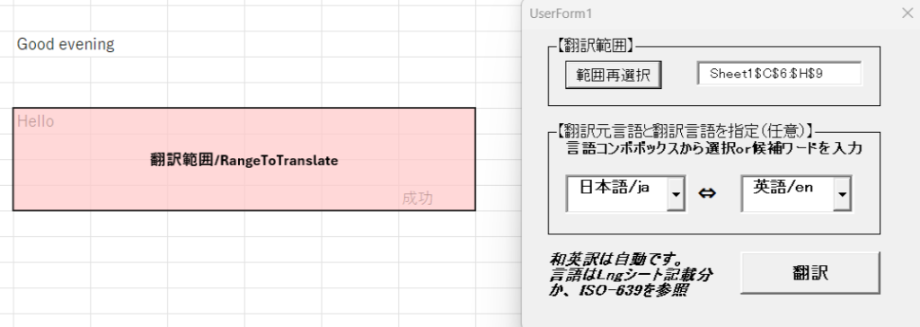 以前紹介したアクティブシート自動和英訳マクロ(https://gakuhenn.com/vba-sheet-autojnentranslation/)の改良版です。シート上の自動取得範囲と自動和英訳に加え、今マクロではユーザーフォームから選択範囲と翻訳元/先言語を指定できるようにしています。これにより選択したシート上の一部範囲翻訳、和英訳以外の柔軟な翻訳ができます。