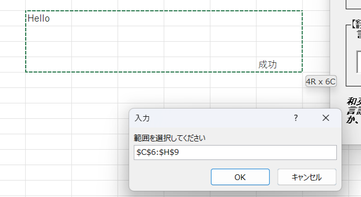 UF上の範囲再取得時はInputboxから範囲を選択します。下記のように再選択した場合は、その範囲が対象範囲となり翻訳されます。