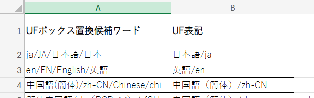 B列はUF表示用の表記で、日本語と、/ ISO-639言語表記が記載されています。スラッシュの後ろがISOの言語コードとなっており、Google翻訳で必要なものとなっているため、変更はできません。