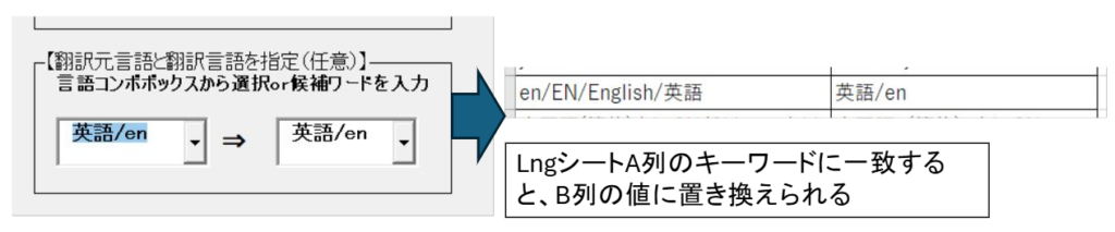 言語はコンボボックスから選択か、Lngシートに設定したキーワード直接入力することで指定可能です。直接入力時はLngシート設定のワードを指定すると部分一致でセル位置が取得され、値が自動変換されます。