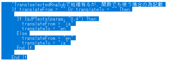 翻訳対象値以外の引数はOptionalとなっており、指定しない場合は自動和英訳がされます。これはワークシートでも使用できることを目的としています。Gootransl_DefJPandEN関数での翻訳元、先言語の引数に指定がない場合は、自動で和英判定され、翻訳されます。今マクロでは、TranslSelectedRngプロシージャで、UF上で指定された言語を指定していますが、指定がない場合のために下記の和英訳自動指定スクリプトを残しています。