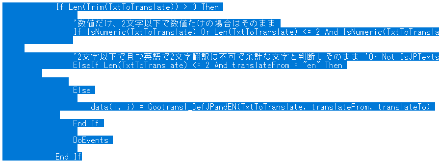 高速化のため、空欄や数値、2文字以下で英語の場合は処理をスキップしています。それ以外の場合にGootransl_DefJPandEN関数を呼びだし、引数にある翻訳元/先言語を元に翻訳します。一方で1シート全てHttpリクエストしてGetする動作を繰り返しているため、セルが多いと多少時間がかかります。翻訳ループ中には、操作のためにDoeventsを記載し処理中の操作可能にしています。