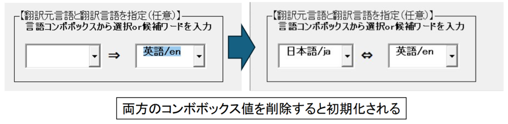 初期値に戻したい場合(自動和英訳)は両方のコンボボックスの値を削除してください。